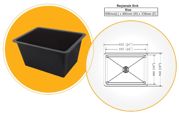Sink, Square, Polypropylene Plastic Black for Pharma & Lab