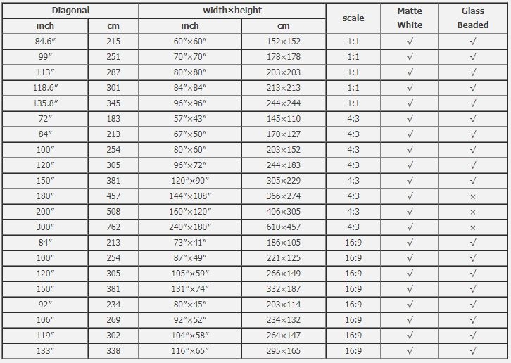 Material of screen surface: Matte White, Grey matte white, Glass beaded, Grey glass beaded.