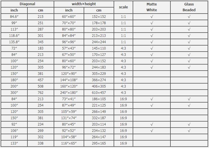 Material of screen surface: Matte white, Grey matte white, Glass beaded, Grey glass beaded.