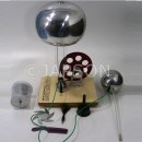 For production of high voltage static electricity, selfexciting, with insulating prespex stand, rubber belt, removable metal dome, mounted on base, with a driving wheel and driving belt. The discharge sphere is mounted on a pivoted arm with handle for adjustment and is attached to driving wheel support. With a 4 mm socket at top of the dome and a 4 mm earth socket in the hand wheel support. Supplied with discharging sphere. WIth standard accessories.